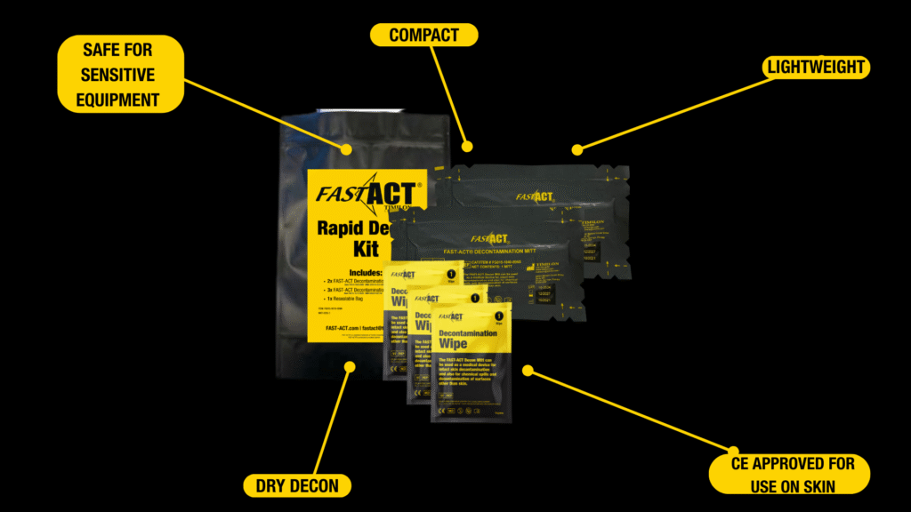 FAST-ACT provides dry decontamination solutions that support rapid, field-ready response to chemical agents, toxic vapors, and hazardous materials across high-risk environments.